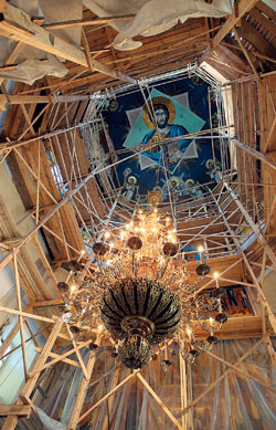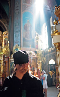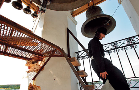 Отец Элизбар карабкается на колокольню. Литургия закончилась, время звонить — он это дело любит. Здесь, наверху, кажется, что мы на высокой мачте, даже есть ощущение, что башня качается на волнах. Если вы в ясную погоду подлетаете к Шереметьево на самолете, то нас очень хорошо видно: видите, вон там, впереди, канал имени Москвы? А прямо под вами — яркий блик от золотого купола, прямо на крутом берегу. Хорошо видно? Нет? Ну, ладно, летите дальше. «Известия», специально для «РР» Фотографии: Сергей Каптилкин для «РР» Дмитрий Соколов-Митрич Русский репортер 13 октября 2008 г.