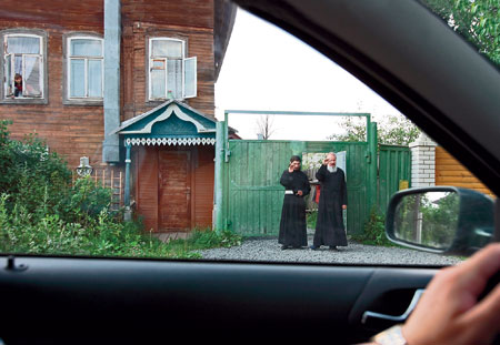 — Она-то нас и свела, — рассказывает матушка Людмила вторая. — Первый раз наше свидание прошло неудачно: мы друг друга не поняли и пришли в разное время в разные места. Но пока это единственный случай, когда у нас возникло какое-то непонимание. Протоиерей Андрей Лазарев и дьякон Элизбар Иванов возле своего общего дома в Кимрах.
